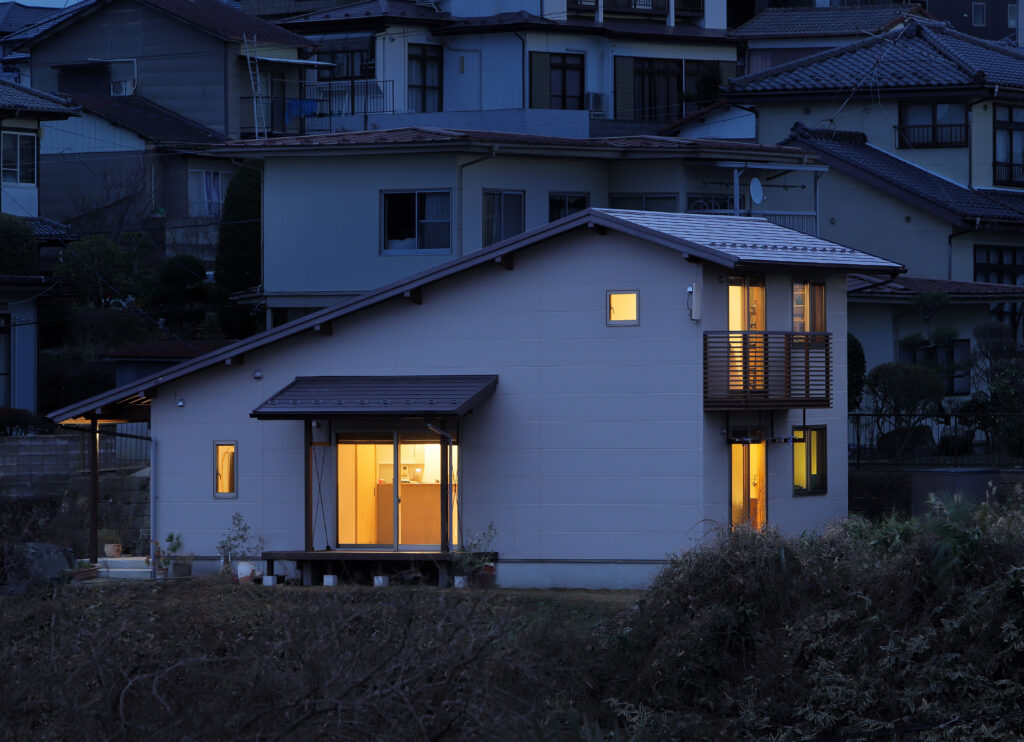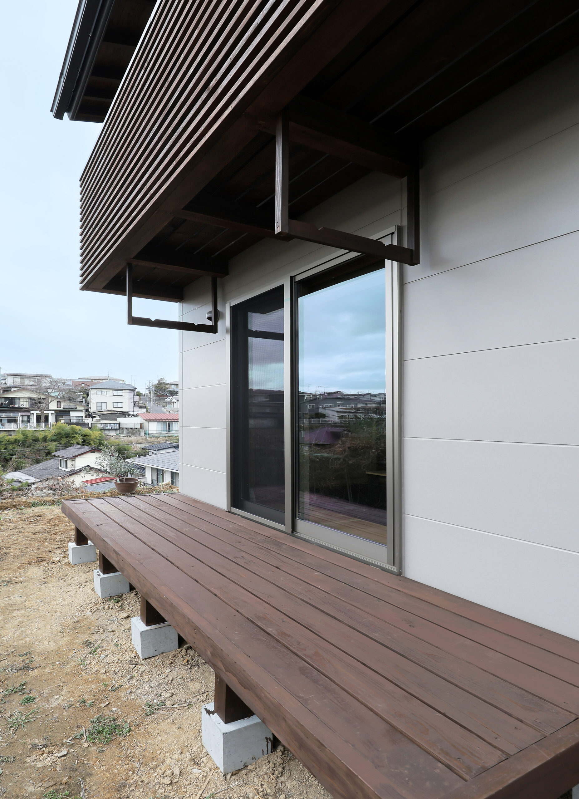 高台の丘陵地に建つ大屋根の住宅です。周辺が傾斜地のため前面に抜けがあり、開放感が感じられます。